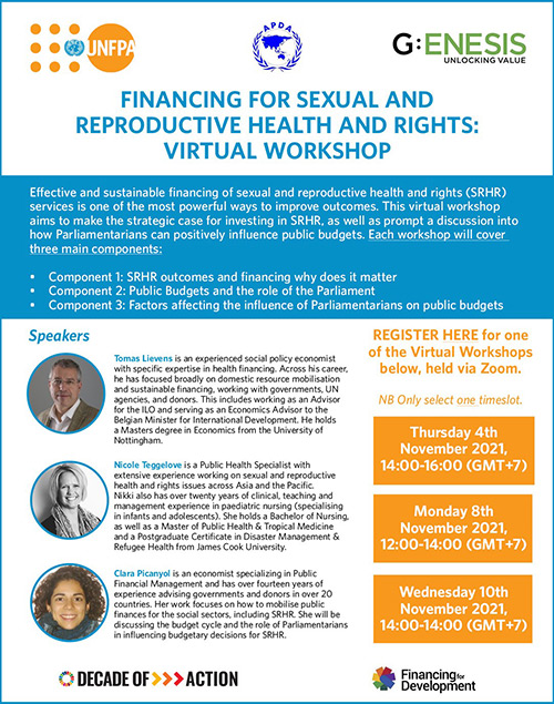 In relation to this, a stand-alone virtual workshop was held three times to provide a high-level overview of the strategic elements of financing for SRHR, in cooperation of UNFPA, G:ENESUS* and the Asian Population and Development Association (APDA).